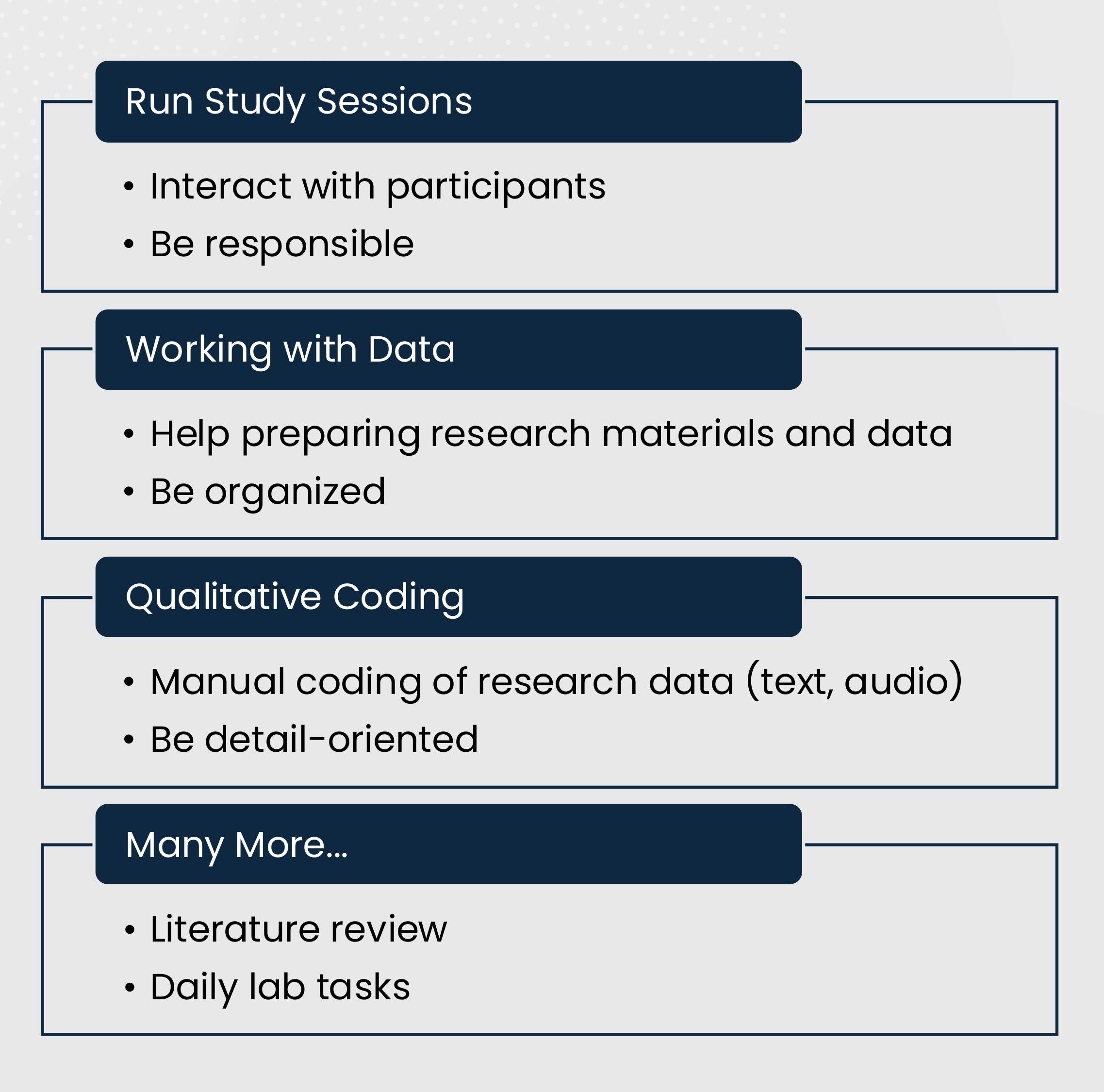 As a research assistant, you will gain firsthand experience with how research is conducted. You will learn about many steps of the research process including idea generation, ethical considerations, study design, participant recruitment, data collection, data coding, data entry, and more. Research assistants are also expected to actively participate in lab meetings.